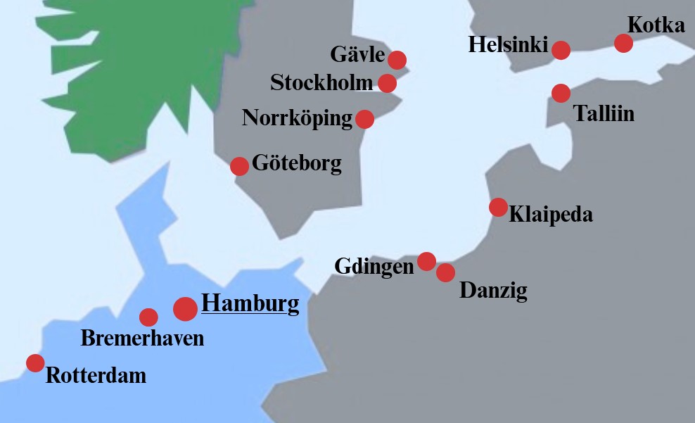 Hamburg – Kiel Canal – Gavle – Stockholm – Norrkoping – Gothenburg / all Sweden – Gdynia – Gdansk / bot Poland – Helsinki – Kotka / both Finland – Tallin / Estonia – Klaipeda / Lituania – Kiel Canal – Rotterdam – Bremerhaven – Hamburg or similar