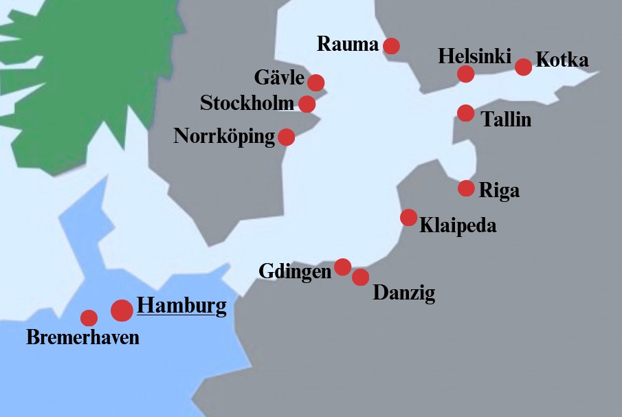 Hamburg – Kiel Canal – Riga / Latvia – Tallinn / Estonia – Helsinki – Kotka – Rauma / all Finland – Klaipeda / Lithuania – Gdynia – Gdansk / both Poland – Norrkoping – Stockholm – Gavle / all Sweden – Kiel Canal – Bremerhaven – Hamburg or similar