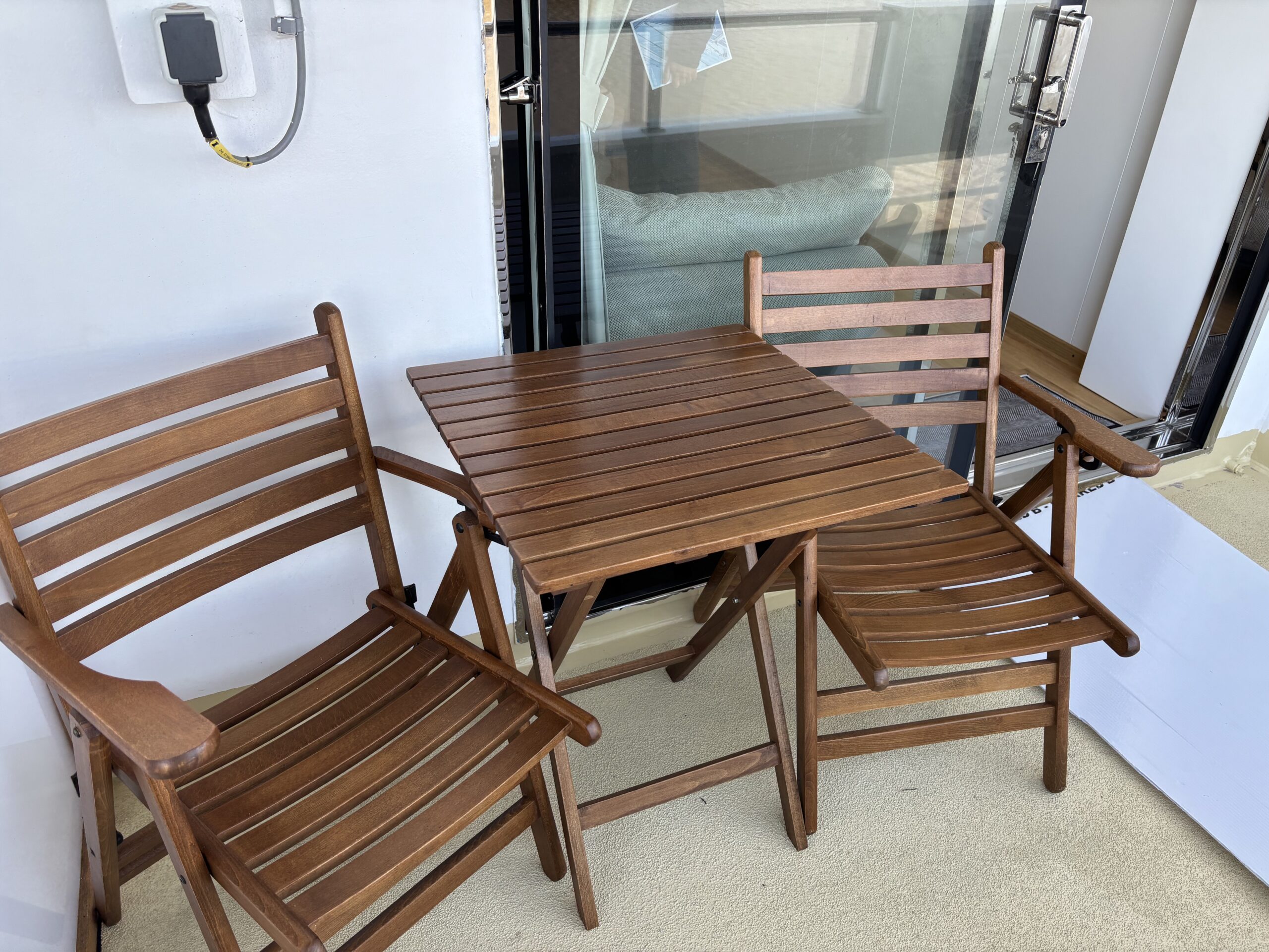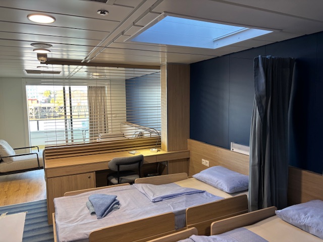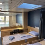 The 27 m² double cabins have beds that can be used as double beds or two single beds (they can be pushed together or separated). There are curtains between the single beds. The living area is structurally separated from the sleeping area and has a large, comfortable seating area. All cabins also have a balcony with comfortable teak furniture. In addition, the cabins have large closet space.