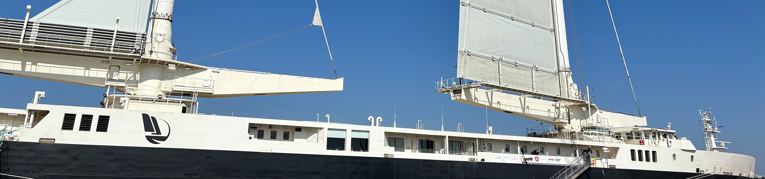 Ro-Ro Frachtsegler, Baujahr 2025, französische Reederei, französische / internationale Schiffsführung, Länge 136 m, Breite 24,2 m, 2 variable Masten, Höhe 88 m auf See, 42 m geklappt, 3.000 m² Segelfläche, Tiefgang 5,50 m im Hafenbereich, 14 m auf See, 5.300 Ladetonnen, Geschwindigkeit 11 kn unter Segeln, 14 kn Motor, Crew 12-14 Personen